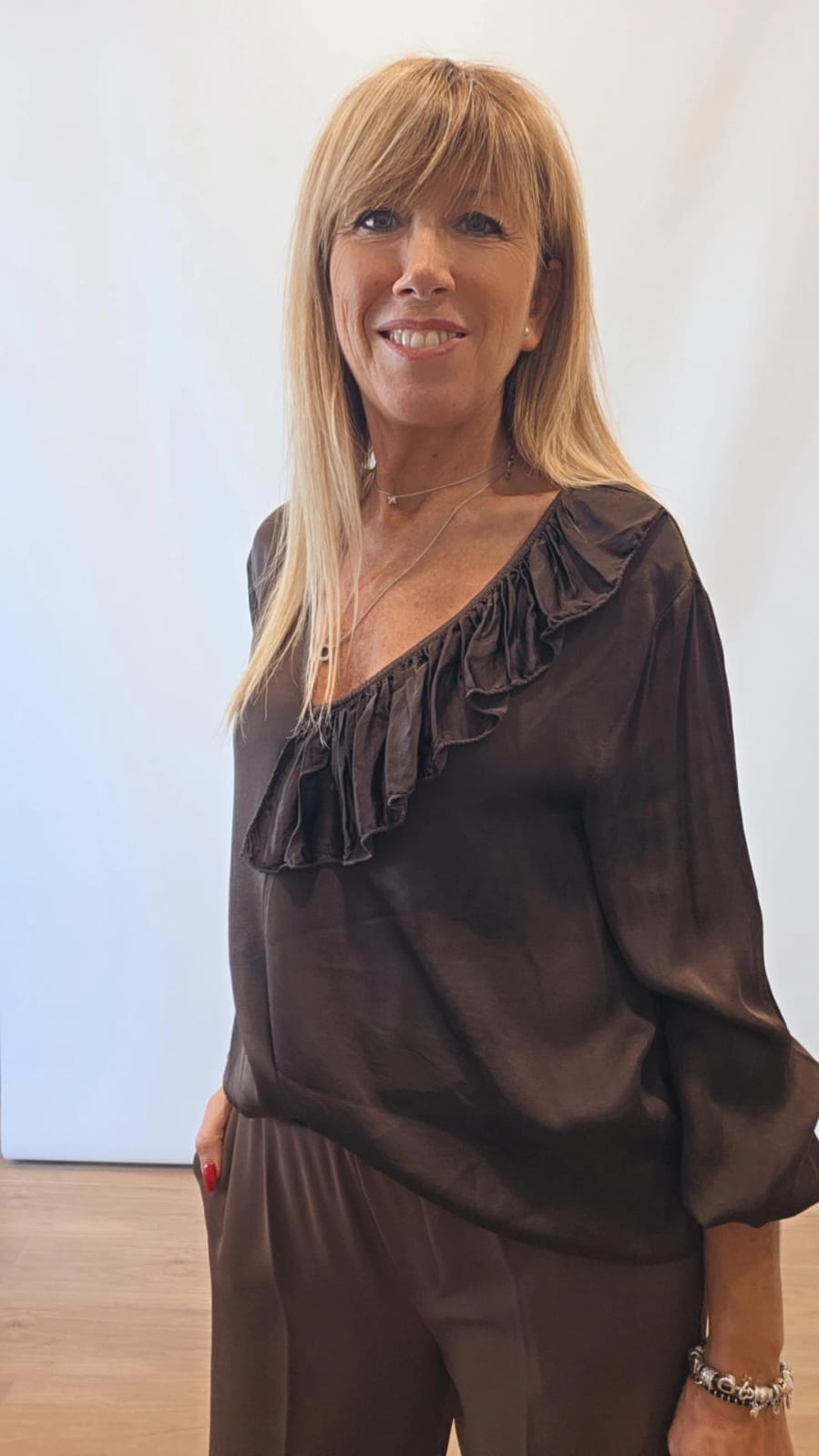Blusa con volants assimetrico nella scollatura e polsino a volants