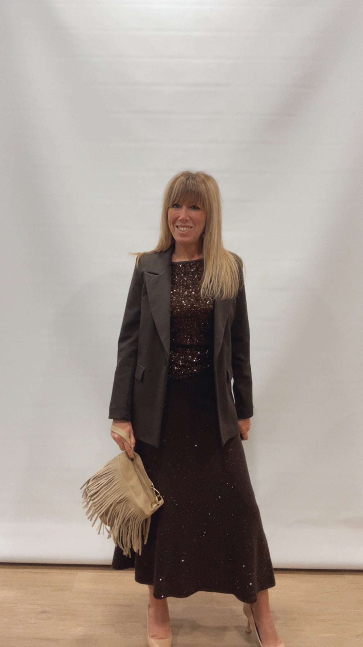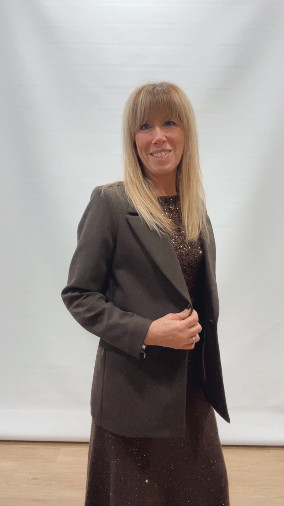Giacca punto Milano un bottone , 2 tasche finte con patta , con spalline leggermente imbottite, vestibilità dritta .