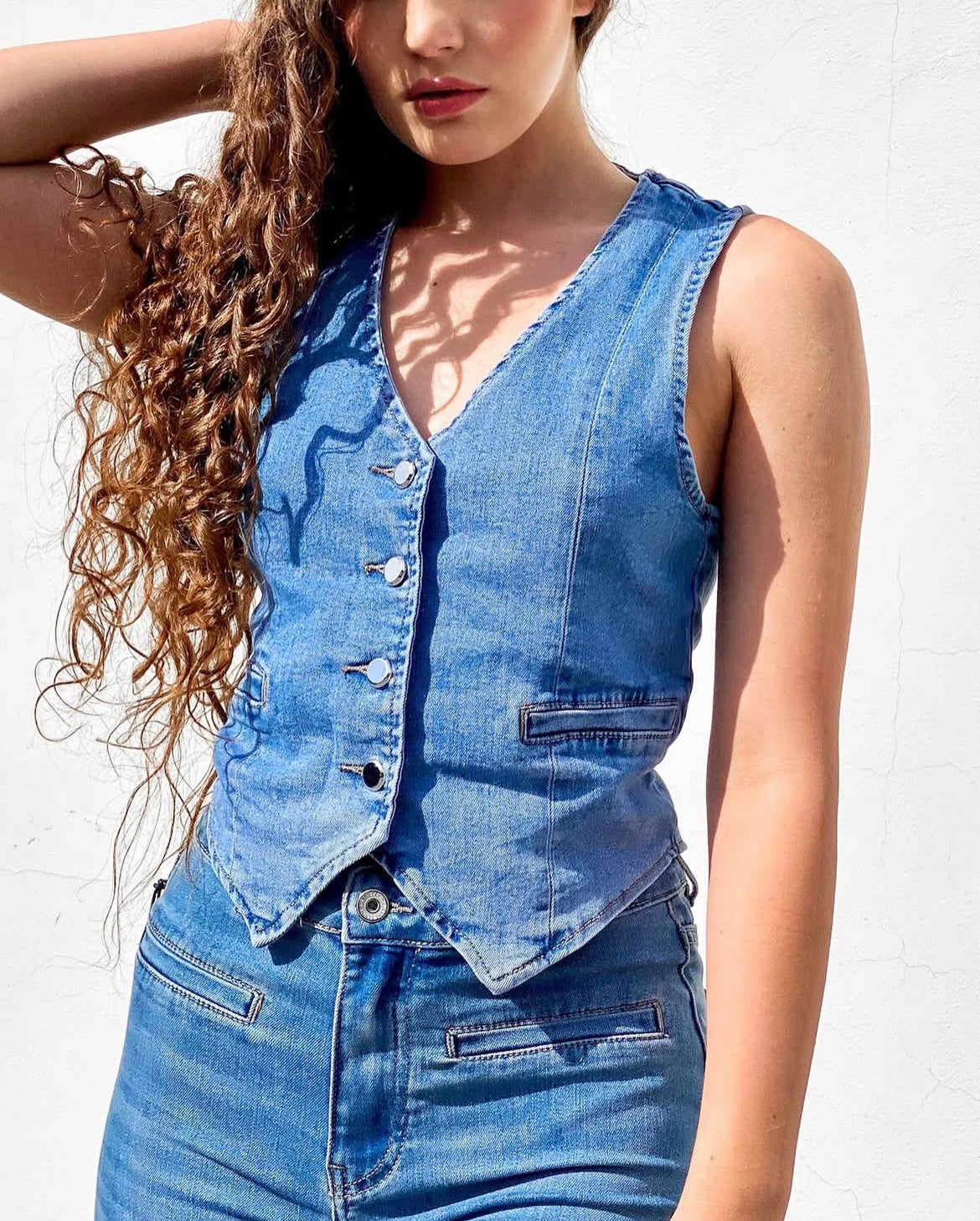 Gilet sfiancato con 4 bottoni taschino finto sul davanti, elasticizzato.