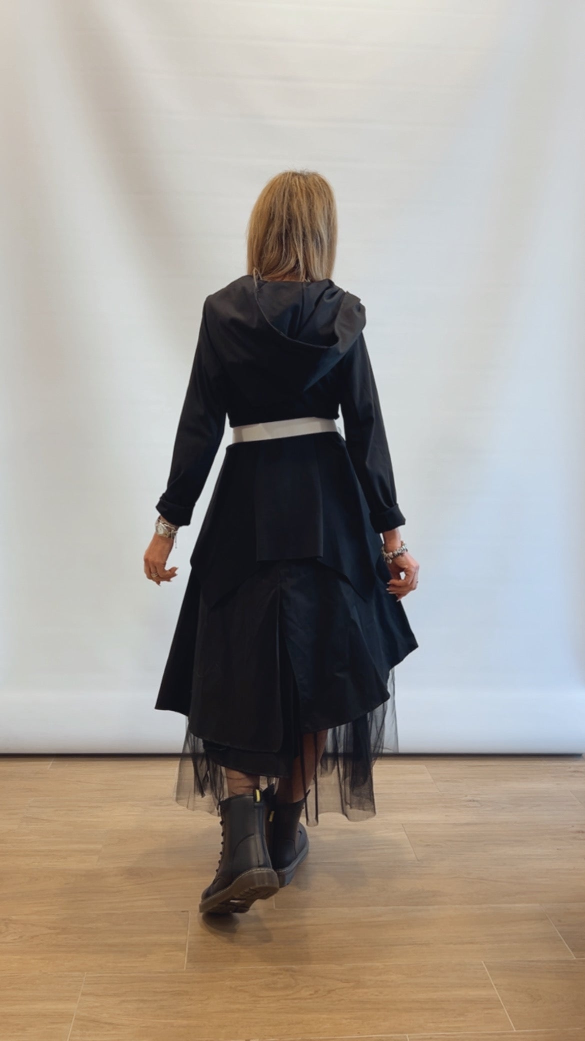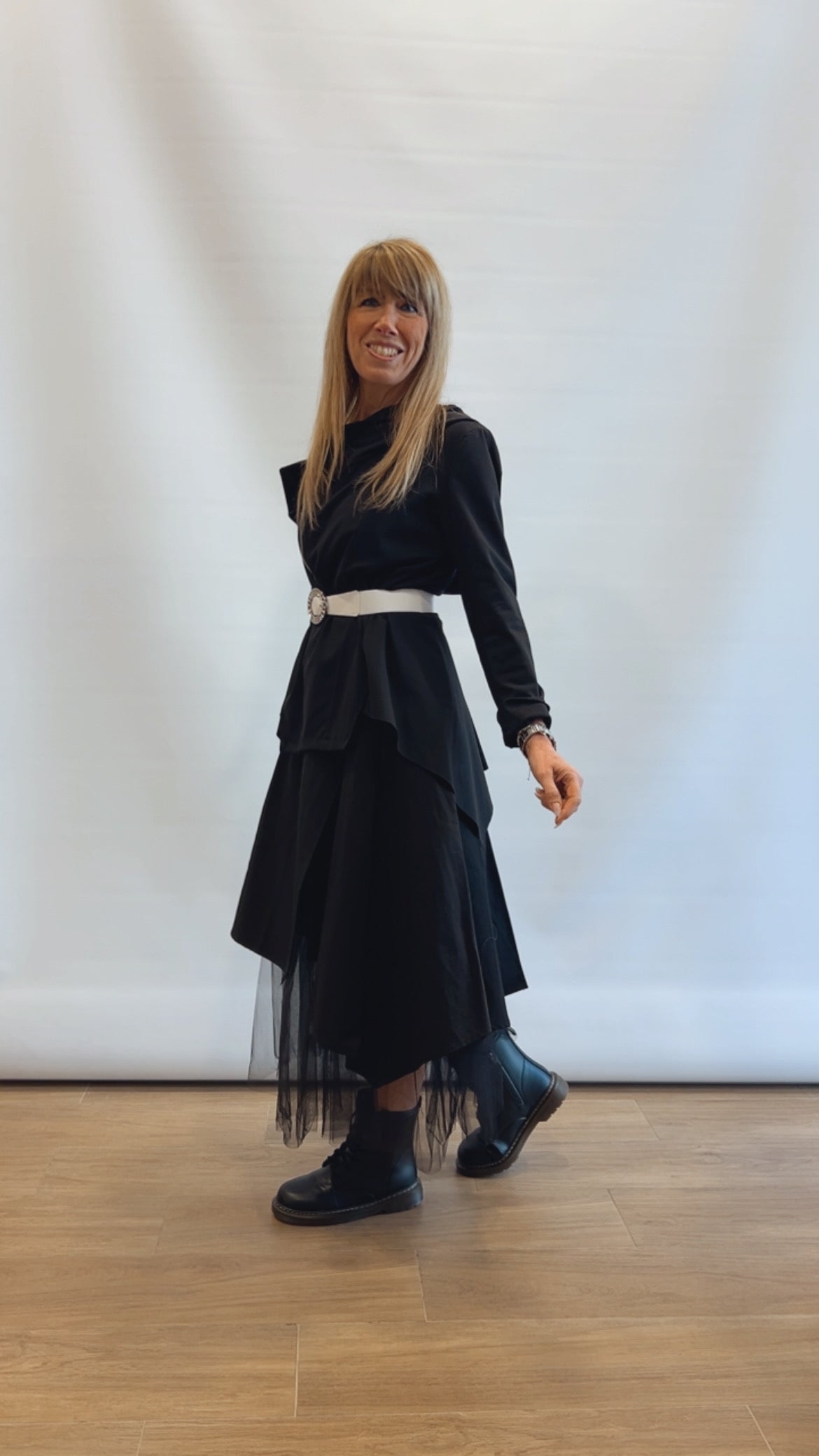 Gonna con elastico nella parte anteriore e cerniera laterale. Foderata con parte finale in tulle .